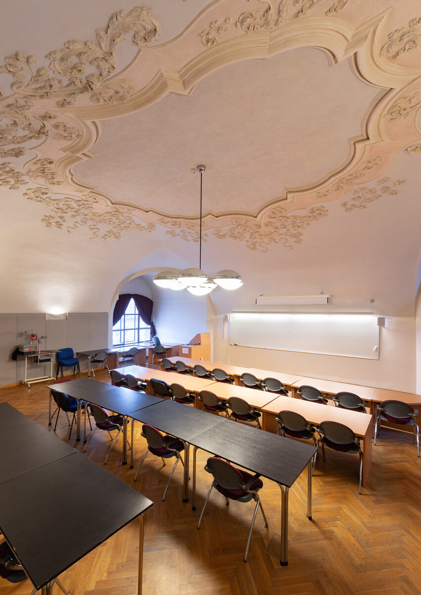 Nejzdobnějším prostorem budovy je rozsáhlý zrestaurovaný refektář s překrásnými nástropními malbami. Zde se konají promoce a další slavnostní akce fakulty. Varhanní prospekt v refektáři pochází ze zrušených varhan ze severních Čech a velkorysostí jeho milosti, pana převora Siostrzonka, byl v nedávné době věnován MFF UK.